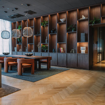 all common spaces | the bar area | bespoke seating in the restaurant and lounge areas | wooden wall with shelves | loose furniture | bespoke booths in the restaurant